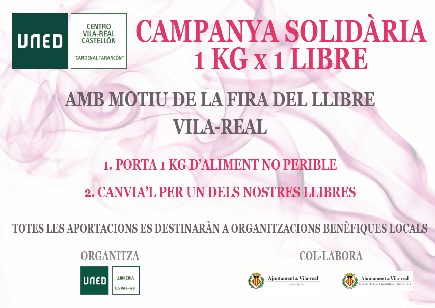 Captura de pantalla 2017-05-25 a las 21.49.18El centre associat a l'UNED a Vila-real participa activament en la Fira del Llibre en una campanya solidària '1 quilo per 1 llibre'. Aquesta iniciativa impulsada pel centre universitari i amb la col·laboració de l'Ajuntament  permetrà als participants donar un quilo d'aliments no peribles i la llibreria de l'UNED els canviarà els aliments per un llibre de la seua col·lecció.