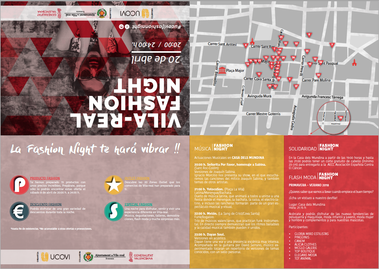 Vila-real tornarà a convertir-se en un gran aparador comercial per cinquè any consecutiu aquest divendres 20, de la mà de la Fashion Night. La cita, organitzada per la Unió de Comerç de Vila-real (Ucovi), amb la col·laboració de la Regidoria d’Economia, donarà protagonisme als comerços locals, que oferiran tot tipus de descomptes i promocions especials, així com regals i sorpreses i organitzaran desfilades, activitats i música en directe, tot entre les 20.00 fins a les 00.00 hores.