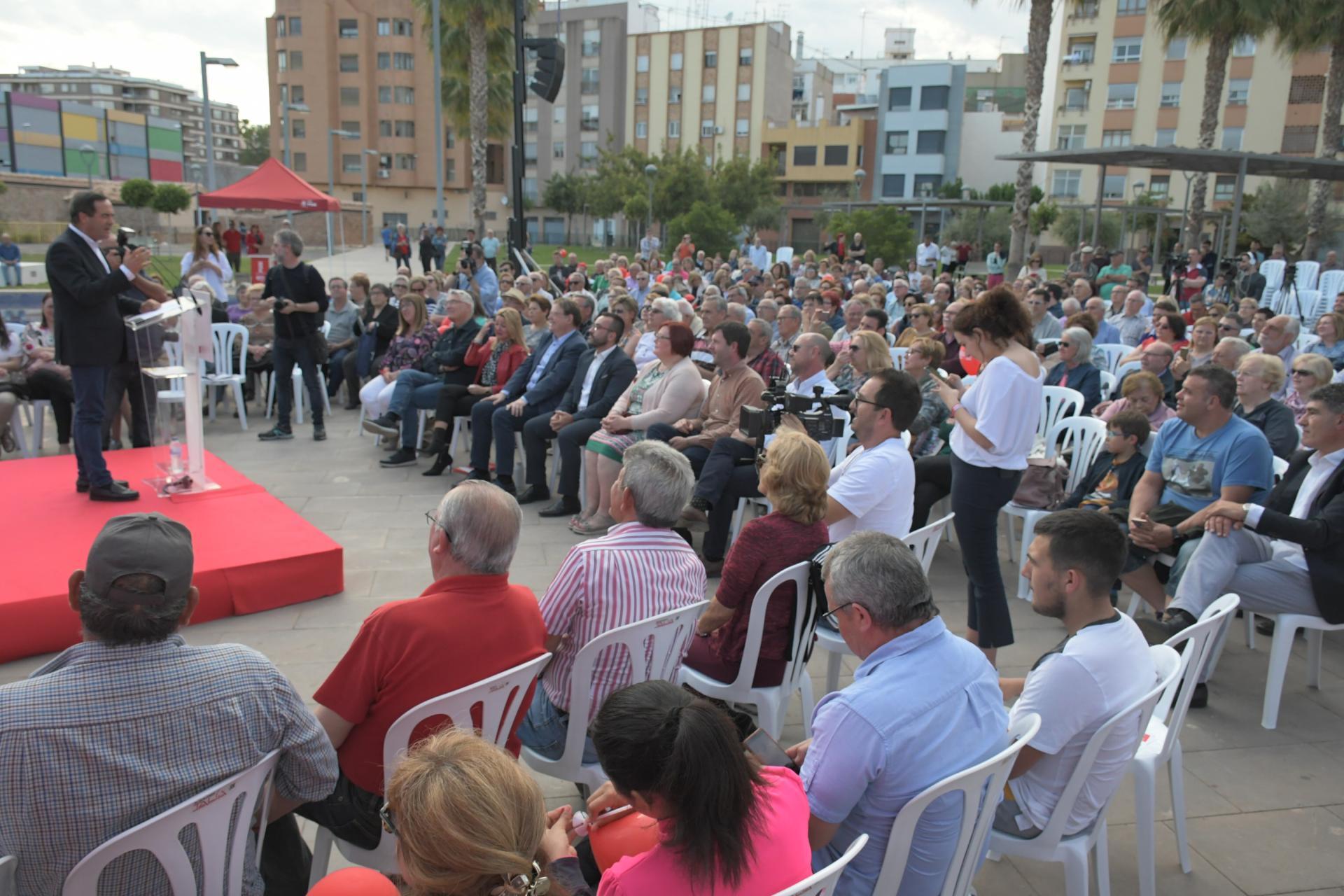 Un Jardí Jaume I ple de veïns, simpatitzants i curiosos ha sigut escenari assistit aquesta vesprada a l’acte central de campanya del PSOE de Vila-real, que tria el mateix espai que quatre anys arrere i els mateixos convidats. El president de la Generalitat, Ximo Puig, i l’ex president del Congrés i ex ministre José Bono han abrigallat aquesta vesprada al candidat del PSPV-PSOE a l’alcaldia de Vila-real, José Benlloch, en l’acte central de campanya celebrat al jardí Jaume I, davant més de 500 persones, segons fons del partit. Un acte en el qual els tres polítics ha posat de manifest la “oportunitat històrica” que es presenta de poder comptar amb un president socialista a Espanya, en la Comunitat i a Vila-real i han destacat la necessitat d’anar a les urnes per a evitar una reculada i que es repetisca el mateix escenari que a Andalusia.