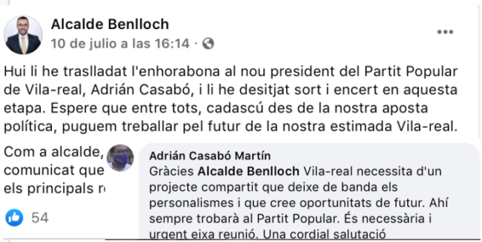 El alcalde de Vila-real, José Benlloch, va traslladar el passat dissabte, dia en el qual es va celebrar el Congrés Local que va proclamar a Adrián Casabó com a president del PP, l'enhorabona i li va desitjar sort i encert en aquesta etapa. “Espere que entre tots, cadascú des de la nostra aposta política, puguem treballar pel futur de la nostra estimada Vila-real. Com a alcalde, estic a la seua disposició per a dialogar i li he comunicat que en breu el citaré, si així ho considera, per a tractar els principals reptes de futur de la ciutat”, va assegurar en les seues xarxes socials, oferiment que Adrián Casabó va acceptar dient “Gràcies. Vila-real necessita un projecte compartit que deixe de banda els personalismes i que cree oportunitats de futur. Ahí sempre trobarà al Partit Popular. És necessària i urgent eixa reunió. Una cordial salutació”.