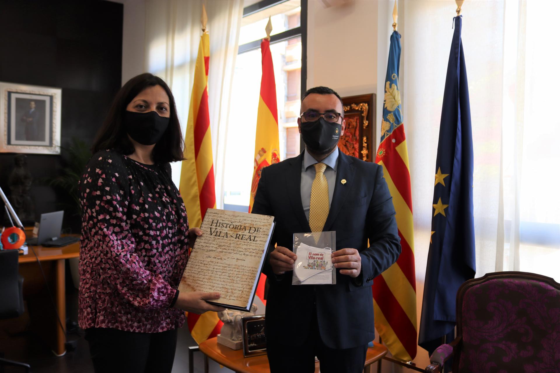 L'alcalde de Vila-real, José Benlloch, ha rebut hui a l'Ajuntament la nova directora territorial de Presidència de la Generalitat en Castelló, Eva Redondo, en una primera presa de contacte després que assumira el càrrec, a principis de mes. Benlloch i Redondo han abordat els temes que hi ha en estos moments damunt la taula entre ambdues institucions. L'alcalde l'ha felicitada per la nova responsabilitat i li ha lliurat un llibre de la Història de Vila-real i altre material promocional municipal, com les mascaretes de la campanya de Normalització Lingüística "El nom és Vila-real".