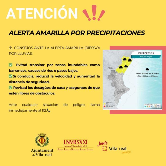 L'Agència Estatal de Meteorologia (AEMET) ha emès una alerta groga per precipitacions intenses que afectaran diverses zones de la Comunitat Valenciana el proper dimecres, 19 de març. L'alerta estarà activa entre les 00:00 i les 06:00 hores, amb possibilitat de Aquesta situació pot generar risc d'inundacions en zones vulnerables com barrancs, llits de rius o passos baixos. Les autoritats recomanen extremar les precaucions i seguir algunes mesures de seguretat. Es recomana evitar transitar per aquestes zones de risc i, si es circula en vehicle, reduir la velocitat i augmentar la distància de seguretat. També és important revisar els desguassos de les vivendes per evitar obstruccions.