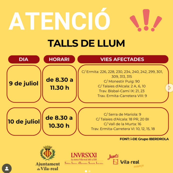 L’Ajuntament de Vila-real ha informat, a través de les seues xarxes socials, que l’empresa i-DE Redes Eléctricas Inteligentes, del Grup Iberdrola, ha programat talls de llum en diferents punts del municipi els dies 9 i 10 de juliol per a dur a terme tasques de manteniment i millora de la xarxa elèctrica.