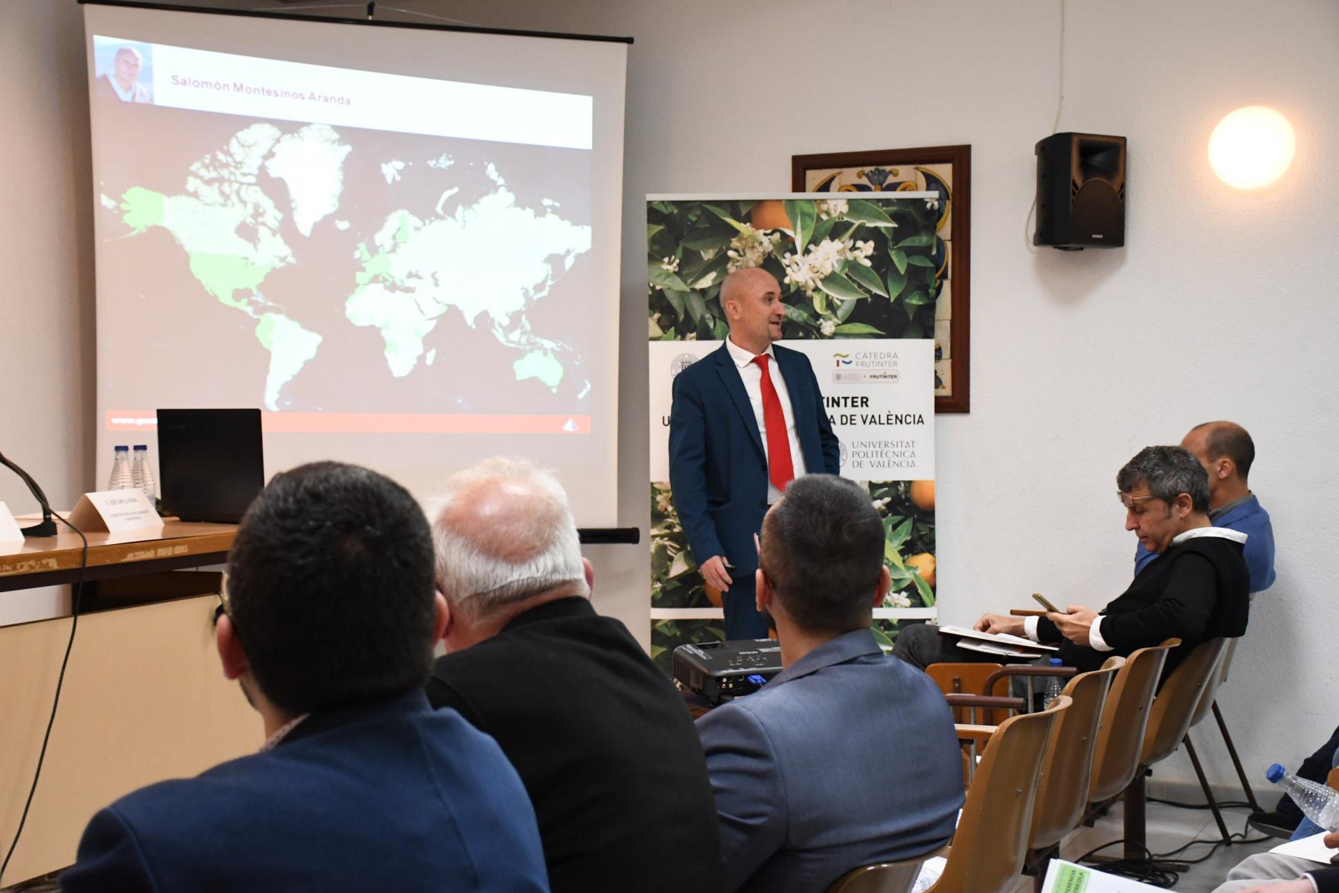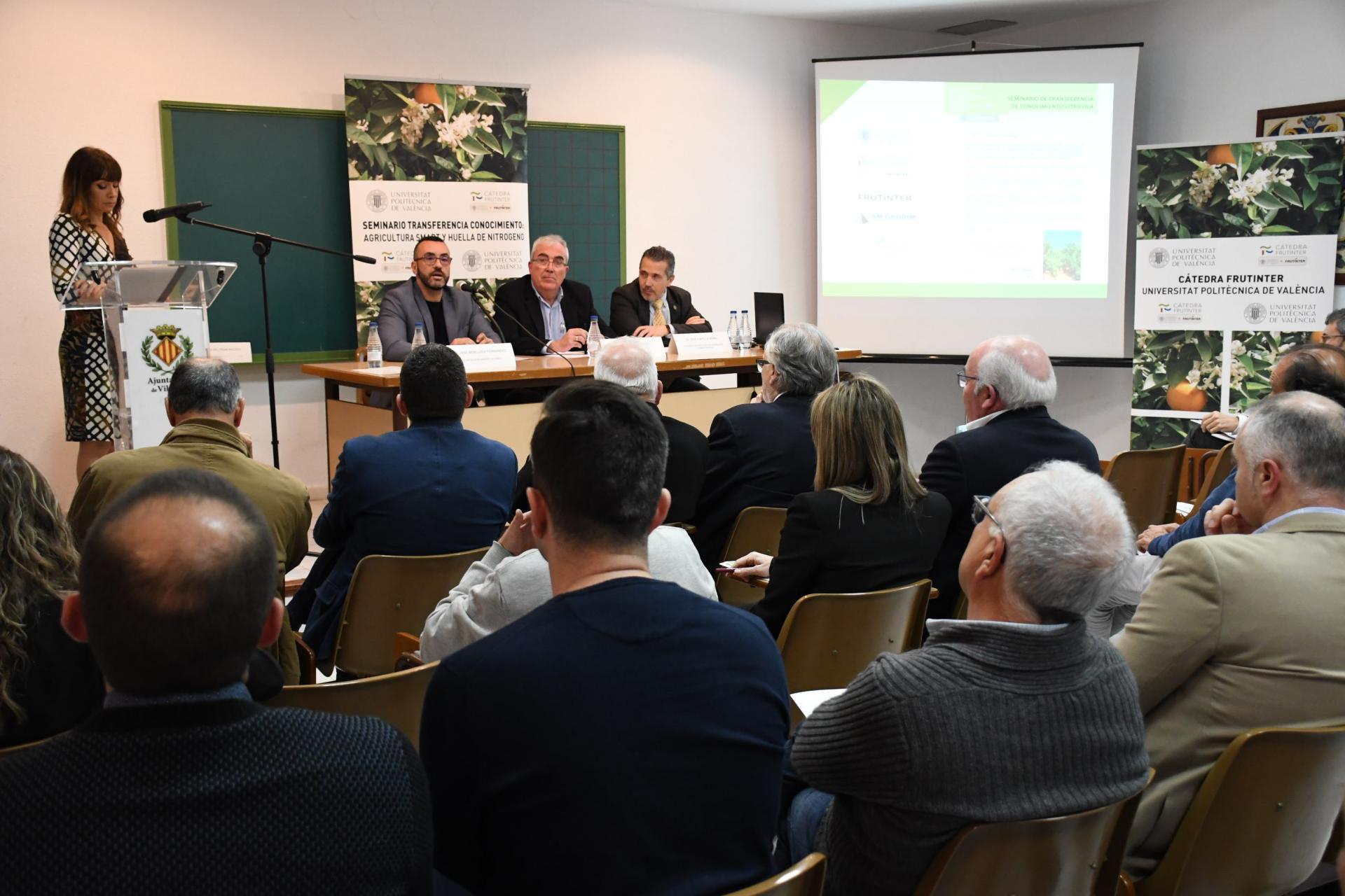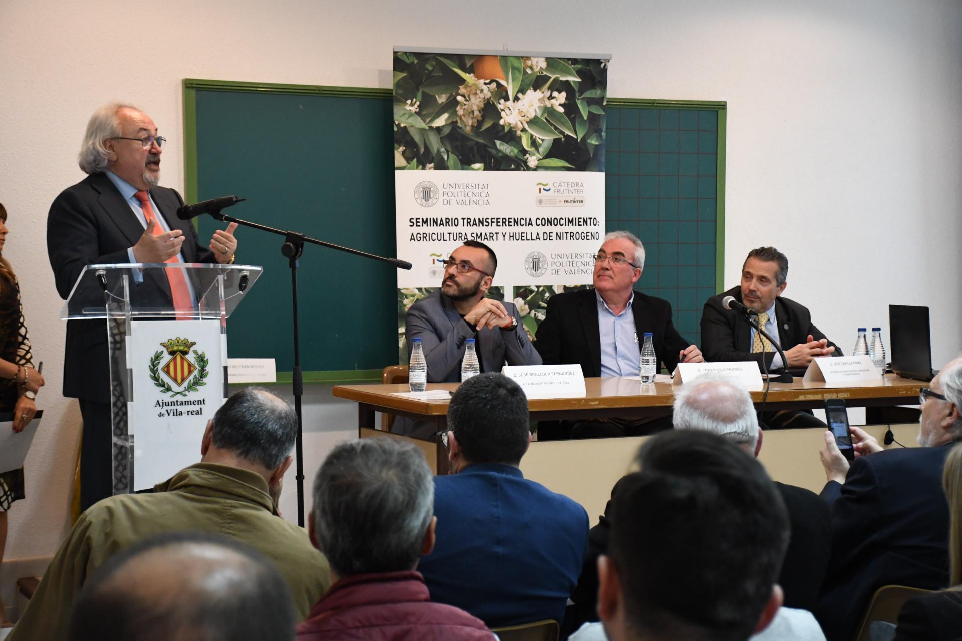 L’alcalde de Vila-real, José Benlloch, ha acompanyat esta vesprada la càtedra Frutínter de la Universitat Politècnica de València en la inauguració del seminari de transferència de coneixement: Agricultura smart y huella de nitrógeno, en el qual han presentat els resultats dels últims projectes en aquest camp, que permeten millorar la productivitat de l’agricultura. L’alcalde ha felicitat la càtedra i l’empresa Frutínter pels seus avanços i aposta tecnològica pel camp com a activitat de futur.