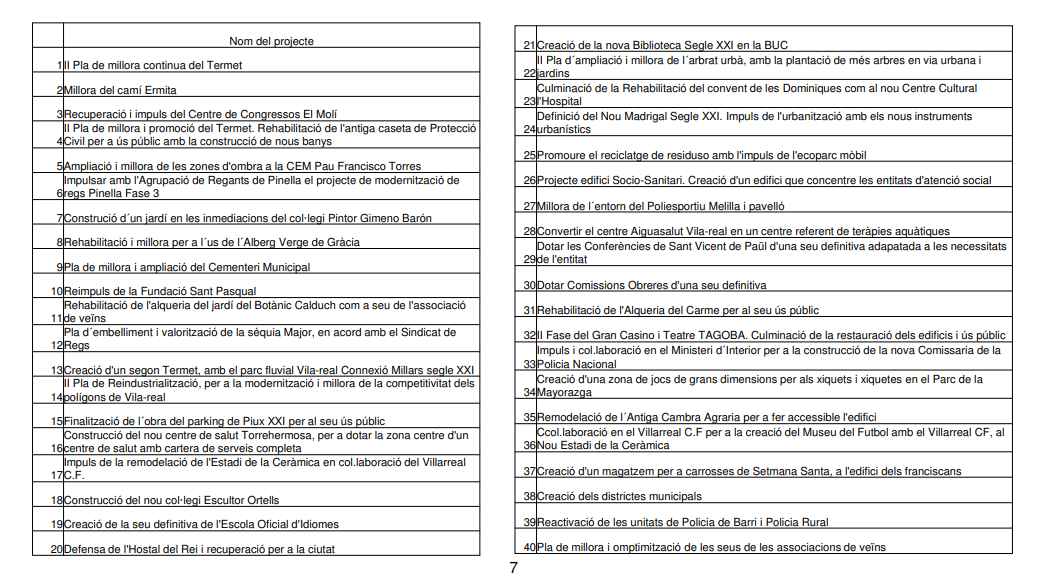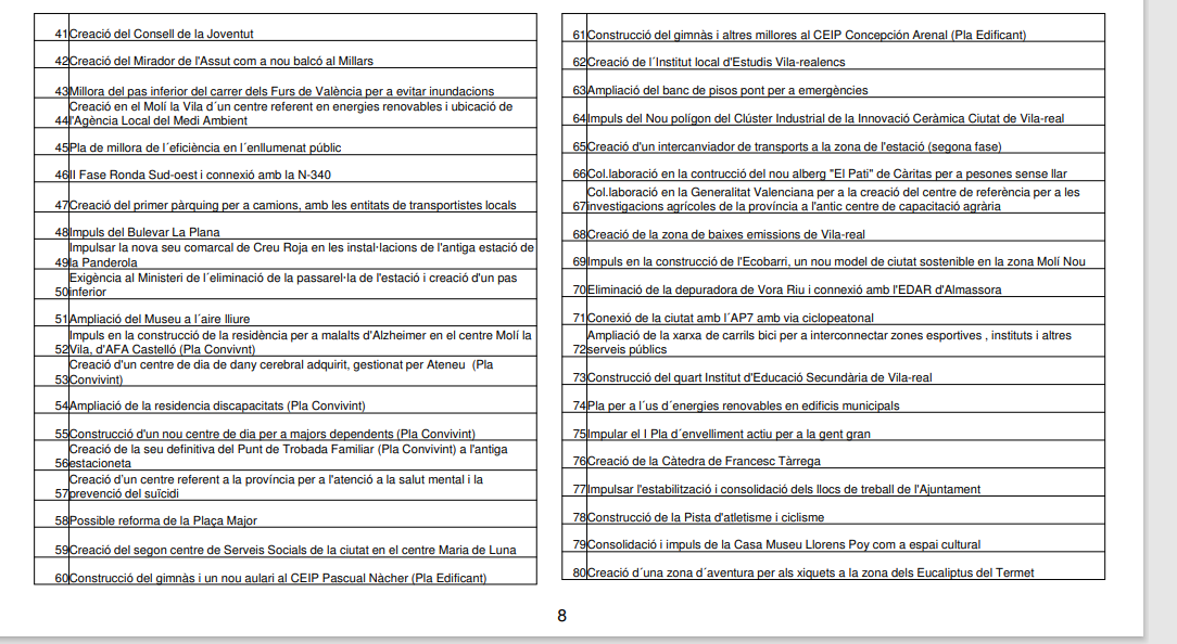 Per a finalitzar, l’alcalde posa l’accent que tots els projectes plantejats són “finançables per la Unió Europea”. Benlloch demana a la ciutadania participació, ja que són projectes no sols per al hui, sinó per al demà, “el que disenyem serem”, conclou l’alcalde.