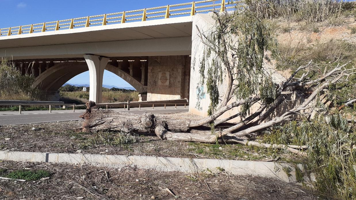 El servei de guarderia rural del consorci gestor del Paisatge Protegit de la Desembocadura del riu Millars format pels ajuntaments de Borriana, Almassora, Vila-real, la Diputació de Castelló i la Generalitat Valenciana han localitzat diversos arbres caiguts a conseqüència de les fortes ràfegues de vent que han assotat les comarques de la Plana Alta i Baixa. A Borriana, Almassora i Vila-real, les ventades han arribat als 70 quilòmetres per hora segons les dades registrades en diverses estacions de l’Agència Valenciana de Meteorologia (AVAMET). La força del vent ha tombat diversos arbres adults. Un d’ells creixia a la vora de la ruta camins de l’aigua, a escassos metres de l’assut comunitari. Es tracta d’un pi blanc (Pinus halapensis) que el vent ha partit per la meitat. La policia municipal de Vila-real per tal d’evitar problemes amb els usuaris hi ha decidit tancar el tram de la ruta camins de l’aigua que discorre des de l’assut comunitari fins al pont de la carretera Nacional 340. Un altre dels exemplars adults que no ha pogut resistir l’empenta del vent és un arbre desmai (Salix babylonica) que creixia al costat de l’Estació Depuradora d’Aigües Residuals d’Almassora. Al vent ha aconseguit arrancar-lo de soca-rel. La guarderia rural també ha pogut comprovar com el temporal de vent ha tombat algun pi a l’ermitori de Santa Quitèria a Almassora.