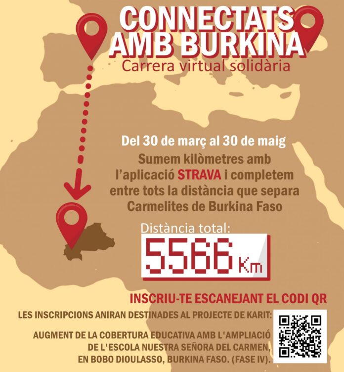Del 30 de març al 30 d'abril, alumnat, famílies, professors i tot aquell que vulga col·laborar, intentaran completar els 5566 km que separen Carmelites de Burkina Faso i així recaptar diners per al projecte que té l'ONG KARIT en aquest país. Amb el projecte es vol augmentar la cobertura educativa amb l'ampliació de l'escola La nostra Senyora del Carmen en Babau Dioulasso (Burkina Faso) en la seua fase IV.