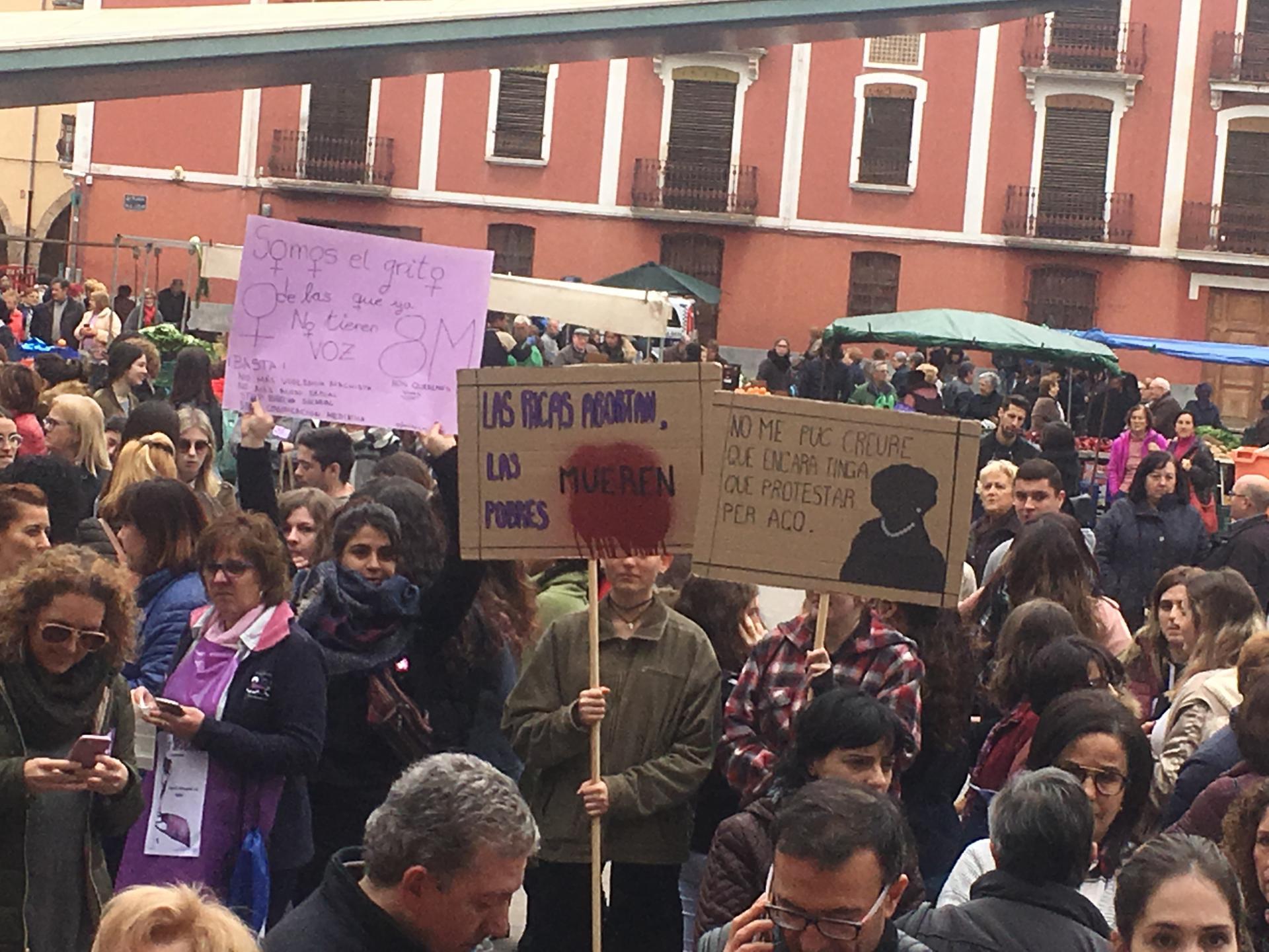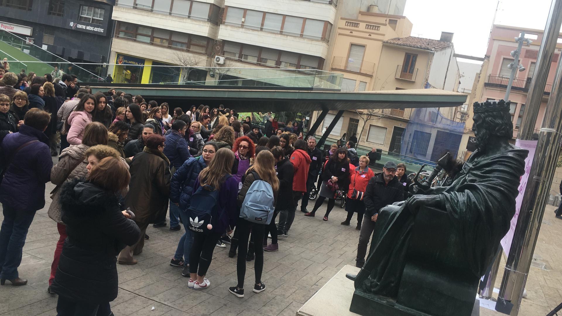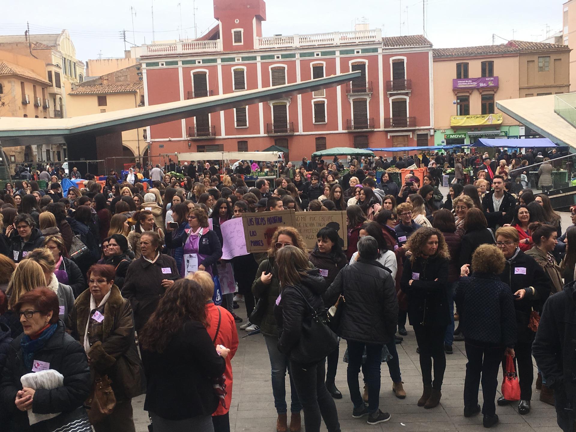També s’ha col·locat un cartell a les portes de l’Ajuntament perquè totes les persones interessades hi pogueren deixar el seu missatge sobre la jornada. Pel que fa a la participació ha sigut nombrosa, ja que a pesar de la pluja amenaçant, arribant a caure algunes gotes que han alarmat als presents, finalment tan sols ha sigut un esglai. Centenars de persones, sobretot dones, han omplit la plaça. Estudiants, persones majors, xiquets i xiquetes, persones de diferents ètnies i religions i professions, totes a una, han fet un crit per a dir no a la injustícia que afecta les dones i no ens deixa crèixer, projectar-nos i ser lliures, que ens fa víctimes de violència i objectes d’una discriminació subtil però que igualment ens empresona, el sostre de vidre.