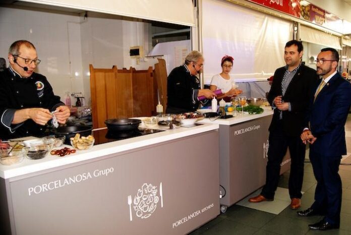 L'alcalde de Vila-real, José Benlloch, i el regidor d'Economia, Xavier Ochando, han assistit aquest matí a una de les sessions de showcooking organitzades en el programació de dinamització del Mercat Central, que compta amb la col·laboració de l'Associació Gastronòmica de Vila-real, els alumnes del mòdul de restaruació de l'escola taller T'Avalem i l'empresa Porcelanosa, que ha donat una cuina mòbil per a la realització de tot tipus d'exhibicions culinàries.