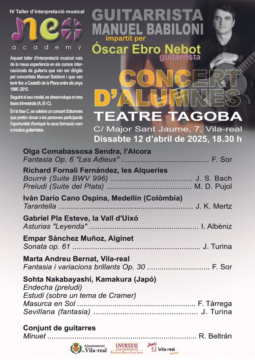 Seguint la filosofia artístic-musical de Manuel Babiloni, el dissabte 12 d’abril a les 18.30 hores es celebrarà un concert d’alumnes dins del marc del IV Taller d’Interpretació Musical, impartit pel guitarrista Óscar Ebro Nebot. L’esdeveniment tindrà lloc al Teatre Tagoba.