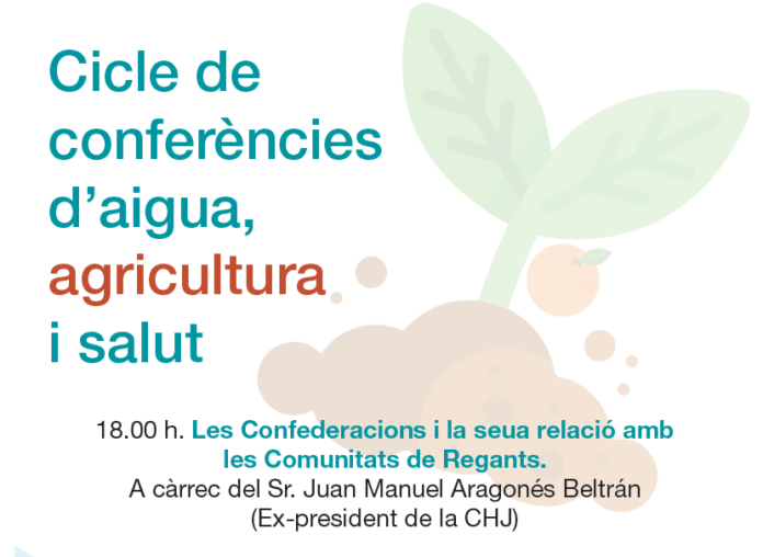 Demà, dijous 23 a les 18.00h al saló d'actes de la Comunitat de Regants de Vila-real, i dintre del cicle de Conferències d’Aigua, Agricultura i Salut, es celebraran les ponències 'Les Confederacions i la seua relació amb les Comunitats de Regants', a càrrec del Sr. Juan Manuel Aragonés Beltrán (Ex-president de la CHJ); 'El futur del regadiu' a càrrec del Sr. Andrés del Campo García (President Fenacore)i la xerrada col·loqui 'Recuperació decompetències de les Confederacions. Gestió i execució d’obres hidràuliques'.