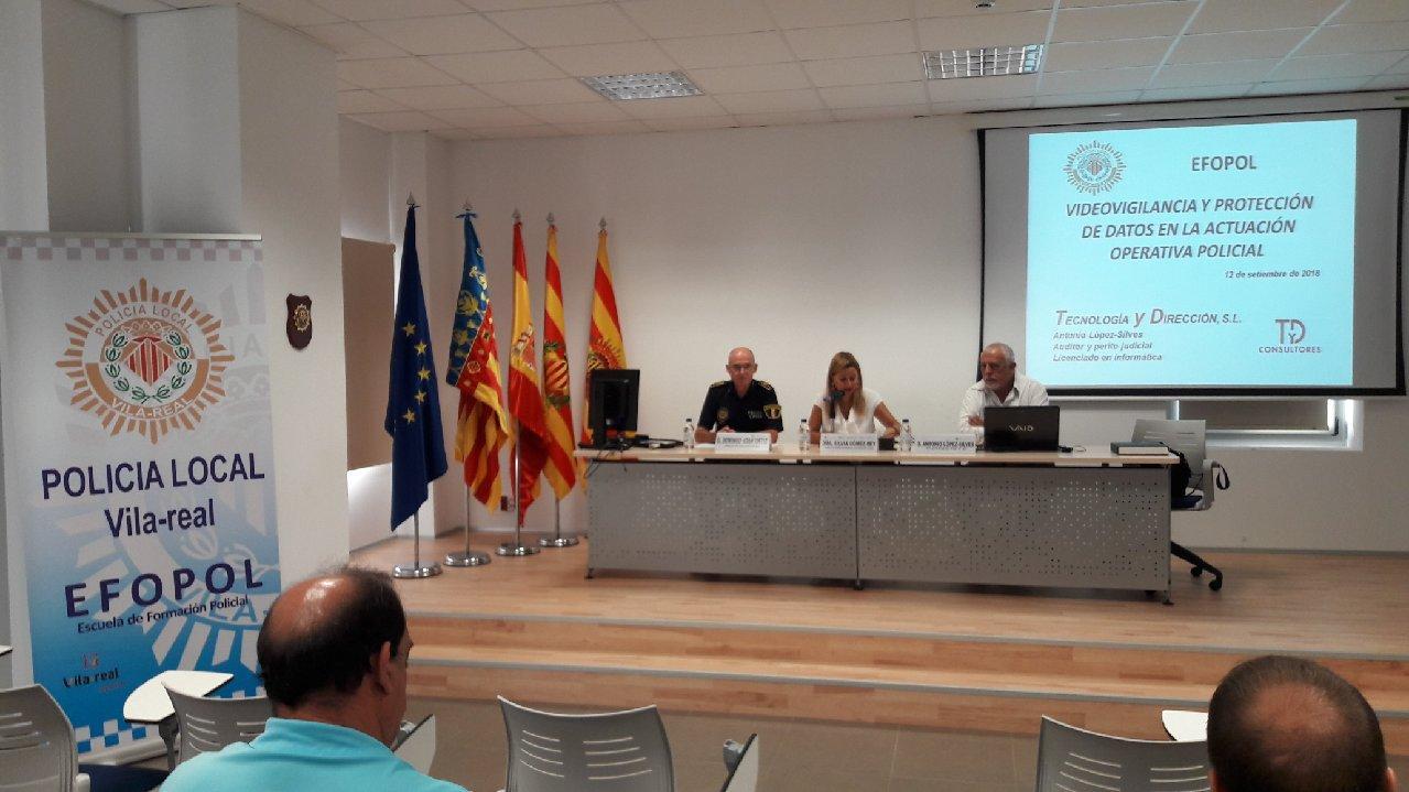 La Policia Local de Vila-real ha impartit aquest matí el curs ‘Videovigilancia y protección de datos en la actuación operativa policial’, que ha comptat amb la intervenció d‘Antonio López-Silves, auditor i pèrit judicial, especialitzat en aquest àmbit. A la sessió han assistit uns 25 agents, tant de Castelló, València i Alacant, com altre altres forces de seguretat, que han pogut conéixer qüestions com l’ús de càmeres en edificis particulars i locals oberts al públic, càmeres simulades, gravacions amb drons o fototografies de menors en les xarxes socials, entre d’altres. La regidora de Seguretat Ciutadana, Silvia Gómez, i el comissari cap de la Policia Local, Domingo Adán, han donat la benvinguda als participants.