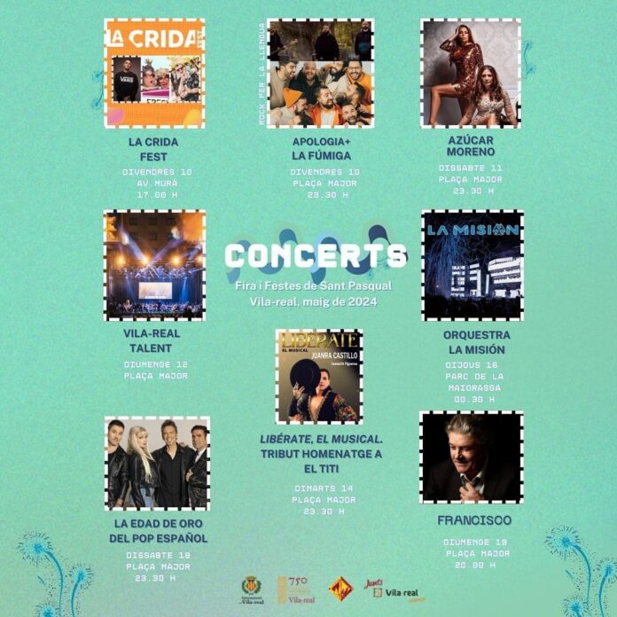 La Junta de Festes de Vila-real ha completat el cartell de la setmana gran en honor a Sant Pasqual amb les actuacions de Francisco, un tribut a El Titi i La Crida Fest. Els concerts se sumen als anunciats dies arrere amb La Fúmiga, el duo Azúcar Moreno, la orquestra La Misión i La edad de oro del pop español.