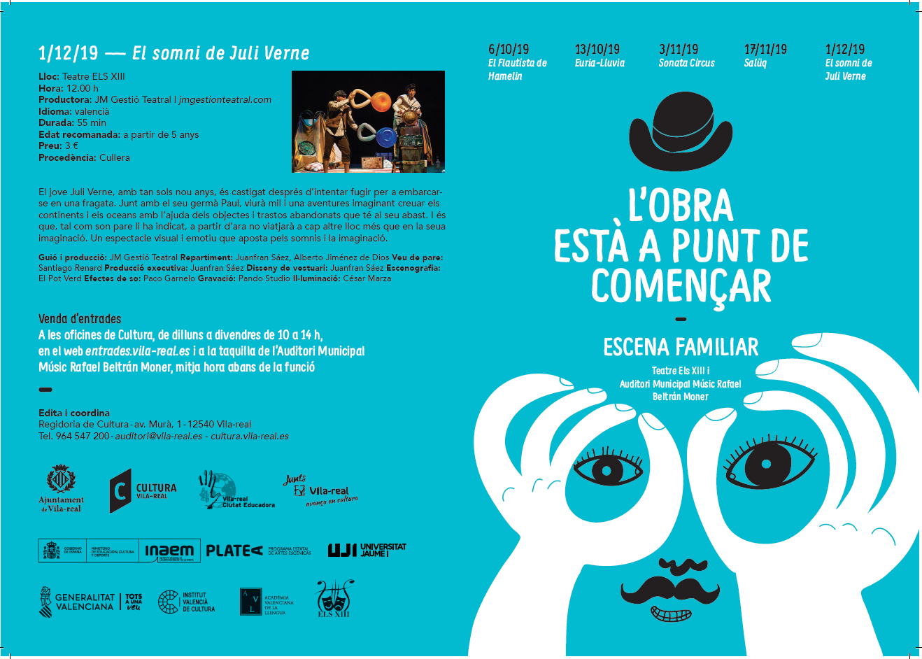‘Euria-lluvia’, el 13 d’octubre; ‘Sonata circus’, el 3 de novembre; ‘Salüq’, el 17 de novembre; i ‘El somni de Juli Verne’, l’1 de desembre completen la programació de l’Escena Familiar de l’últim trimestre. Totes elles es representaran el diumenge a les 12.00 hores, en la sala de teatre Els XIII i l’Auditori Músic Rafael Beltrán. Les entrades anticipades poden adquirir-se en línia en entrades.vila-real.es, de dilluns a divendres de 10.00 a 14.00 hores a l’Auditori o en taquilla, mitja hora abans de cada espectacle, amb un preu d’entre 3 i 6 euros.