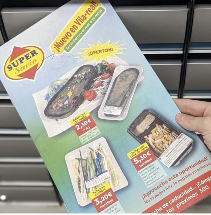 Es tracta d'un fullet similar al d'un supermercat en el que s'alerta: "Nuevo en Vila-real, de la tierra y el mar a tu mesa". A les imatges es poden vore aliments plens de plàstics, per ejemple palletes silulant tallarins exòtics, entre altres exemples.
