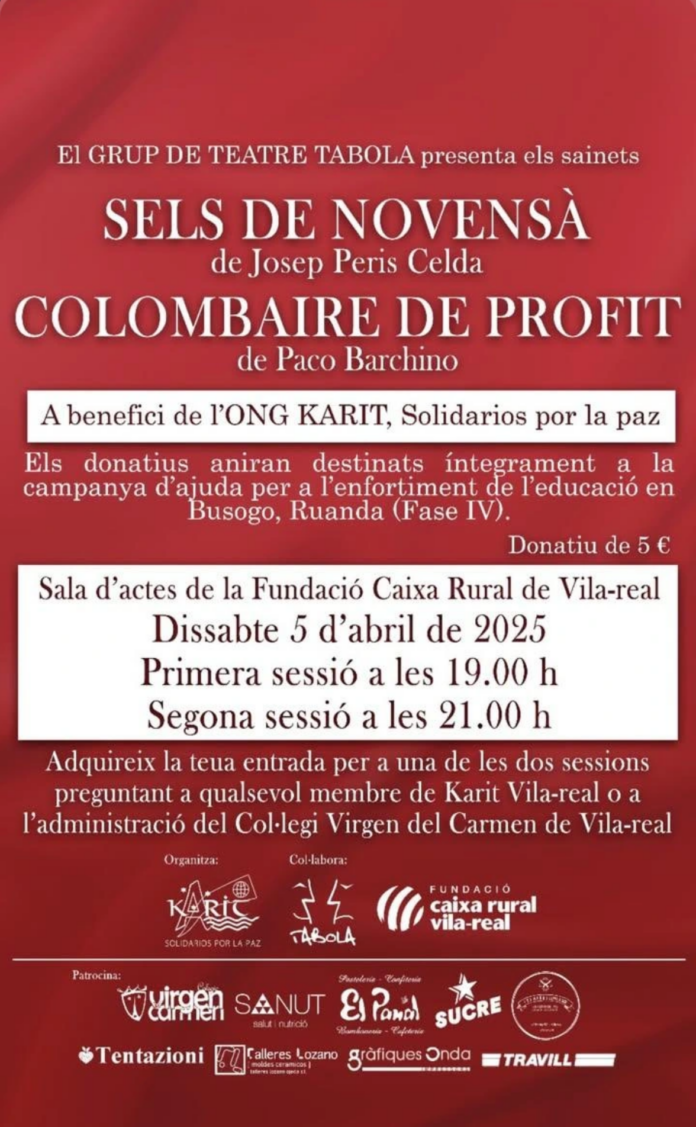 El pròxim dissabte 5 d’abril de 2025, la sala d’actes de la Fundació Caixa Rural de Vila-real acollirà una vetlada teatral amb un propòsit solidari. El Grup de Teatre Tàbola interpretarà dues obres curtes, conegudes com a sainets: Sels de Novensà, de Josep Peris Celda, i Colombaire de Profit, de Paco Barchino.