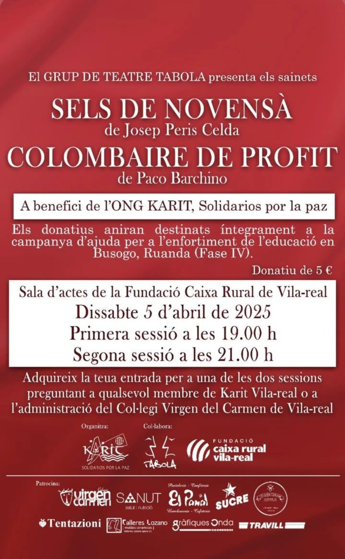Les entrades tenen un preu simbòlic de 5 € i es poden adquirir de manera anticipada preguntant a qualsevol membre de Karit Vila-real o a l’administració del Col·legi Verge del Carme de Vila-real. Per facilitar la participació del públic, es faran dues sessions, una a les 19.00 h i una altra a les 21.00 h.