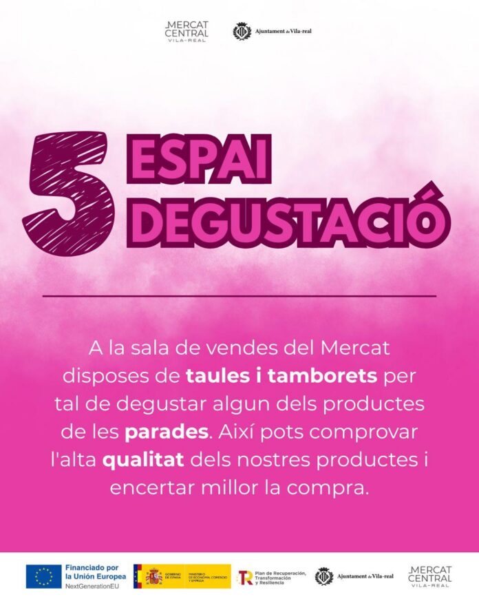 El Mercat Central de Vila-real ha habilitat un Espai Degustació amb taules i tamborets perquè els clients puguen tastar in situ els productes que ofereixen els venedors i venedores del recinte.