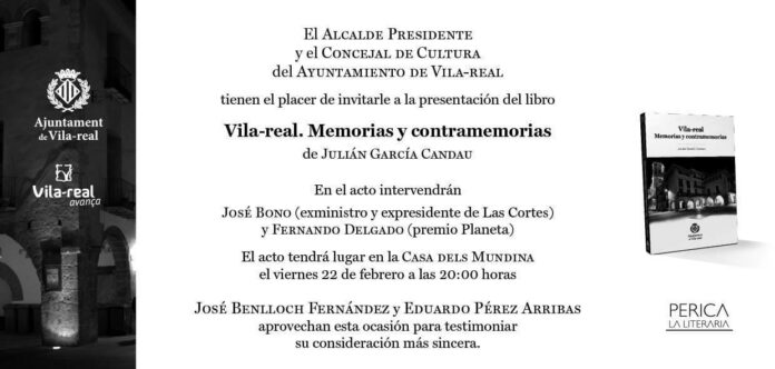 Aquesta vesprada a les 20.00 va a tenir lloc a la Casa dels Mundina la presentació del llibre ‘Vila-real. Memorias y contramemorias”, del periodista i escriptor vila-realenc Julián García Candau, amb la participació del Premi Planeta Fernando Delgado i de l’expresident del Congrés i exministre José Bono. Està prevista l’assistència de l’alcalde, José Benlloch, i el regidor de Cultura, Eduardo Pérez.