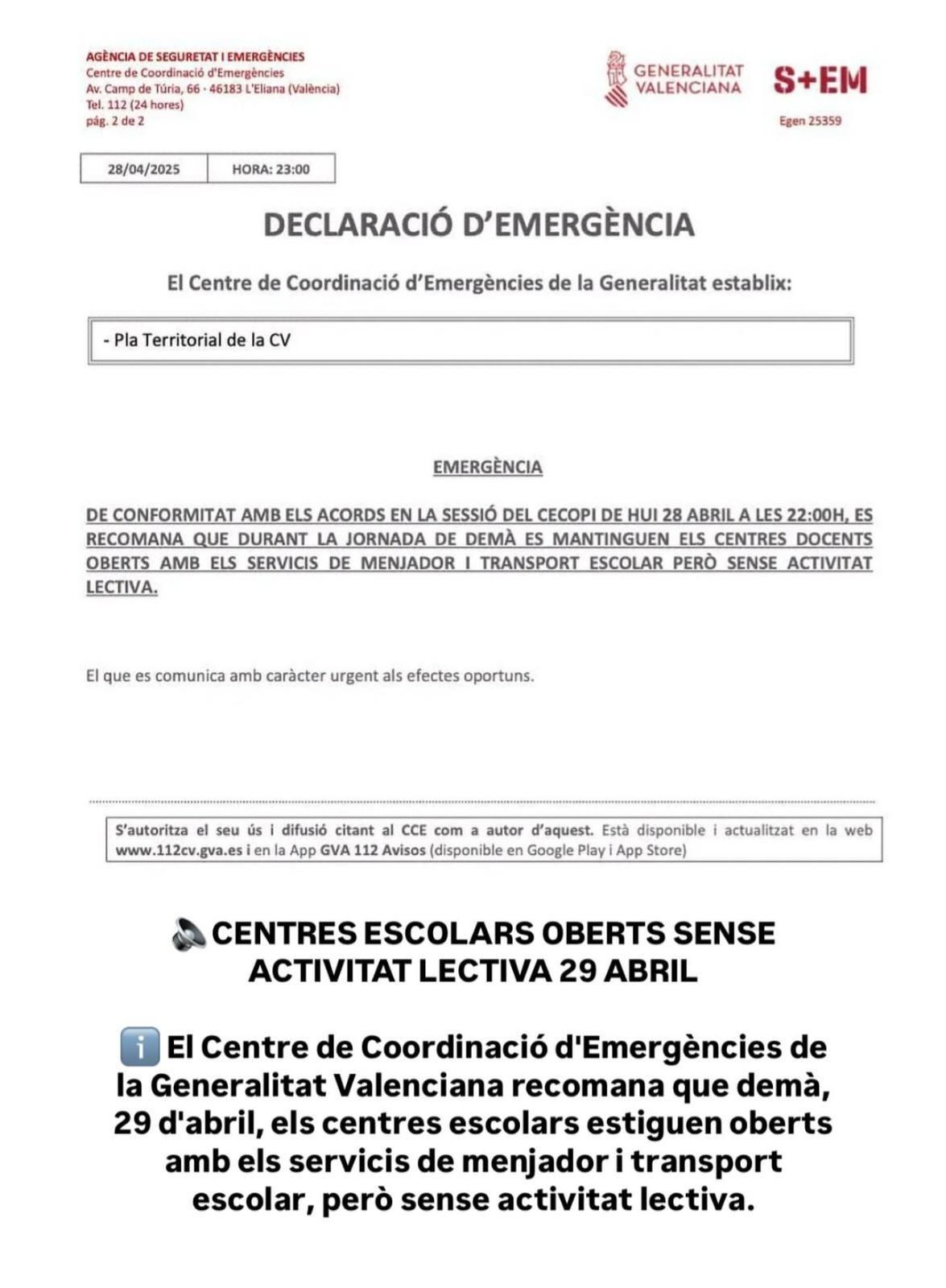 El Centre de Coordinació d’Emergències de la Generalitat Valenciana ha decretat aquest dilluns a la nit una mesura excepcional per a la jornada de dimarts 29 d’abril: els centres docents romandran oberts, però sense activitat lectiva.