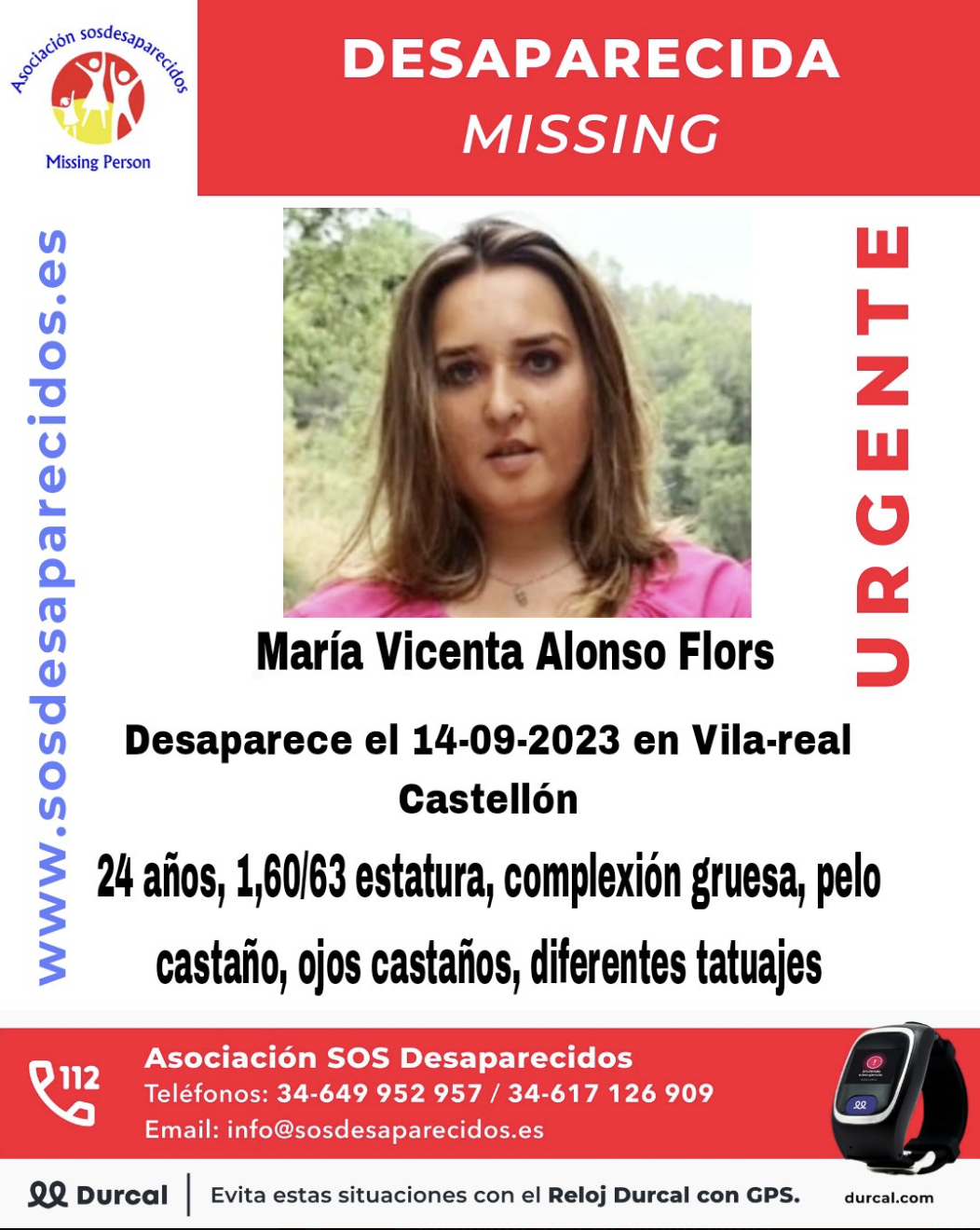 María Vicenta Alonso Flors, de 24 anys, mesura aproximadament 1,60 metres, té una complexió robusta, cabell castany i ulls marrons, i compta amb diversos tatuatges al seu cos.