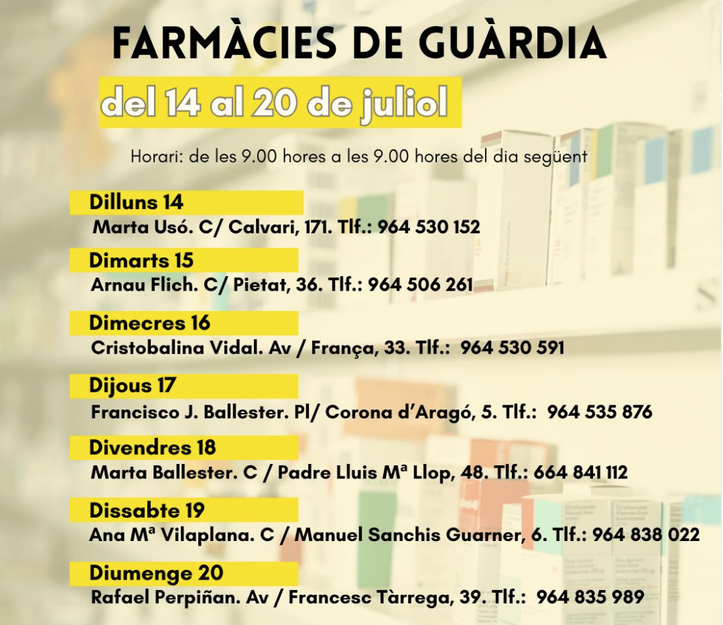Diumenge 20: Rafael Perpiñan. Av. Francesc Tàrrega, 39. Telèfon: 964 835 989