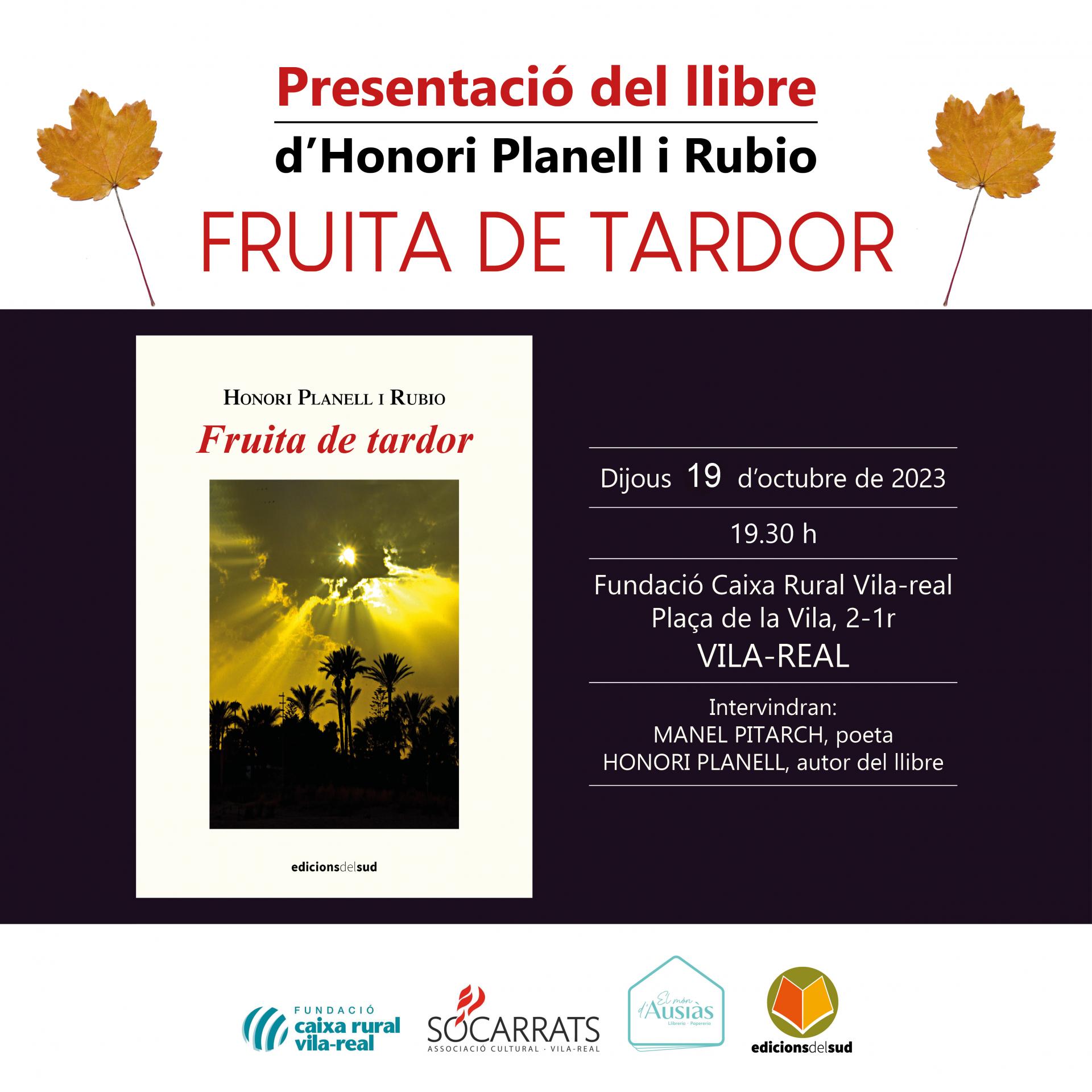 Vila-real Informació Honori Planell i Rubio presentarà el seu llibre “Fruita de tardor” el pròxim dijous 19 d’octubre a Vila-real. Serà a la Fundació Caixa Rural Vila-real (plaça de la Vila, 2 -1r) a les 19:30 h. Intervindrà el mateix Honori Planell, a més del poeta Manel Pitarch.  width=