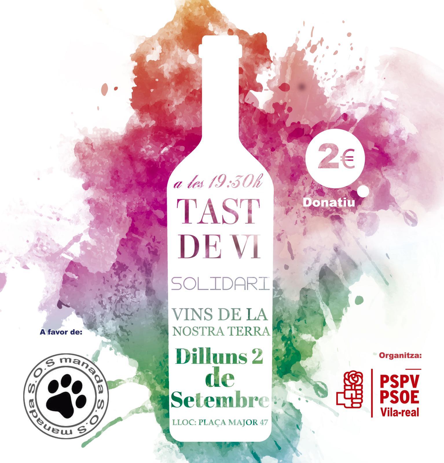 Vila-real InformacióEl PSPV-PSOE de Vila-real ha convocat la tercera edició del Tast de vi solidari, una iniciativa que pretén posar en valor el treball de les entitats i associacions locals durant les festes patronals, arreplegant, a més, fons per a col·laborar amb la seua tasca. Amb aquest objectiu, dilluns se celebrarà el Tast de vi solidari a favor de l'entitat SOS Manada, entitat sense ànim de lucre de Vila-real que ajuda a trobar una llar als animals domèstics que pateixen qualsevol tipus de perill. El Tast de vi, amb Vins de la Terra de Castelló, se celebrarà, com ve sent habitual, dilluns de la Xulla, a les 19.30 hores, a la seu d'Ofiprox del PSPV-PSOE, a la plaça Major, 47. Els participants que vulguen col·laborar amb aquesta acció solidària hauran d'aportar un donatiu de 2 euros.