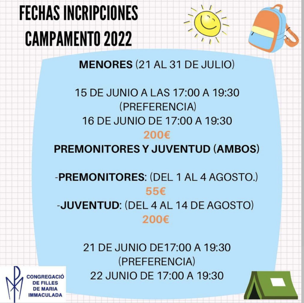 Hui, dimarts 21 de juny de 17.00 a 19.00 es realitzaran les inscripcions del torn de joventut i premonitors a la casa social, amb preferència. És a dir, els acampats que hagen acudit a les activitats la meitat dels dissabtes o pertanguen al grup de danses. Demà, dimecres 22 de juny serà el torn per a la resta, també de 17.00 a 19.00 hores.