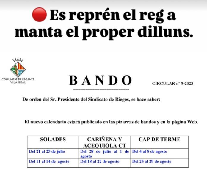 La Comunitat de Regants de Vila-real ha anunciat mitjançant un ban oficial que el reg a manta es reprendrà a partir del pròxim dilluns 21 de juliol, segons el calendari establit pel Sindicat de Riegos.