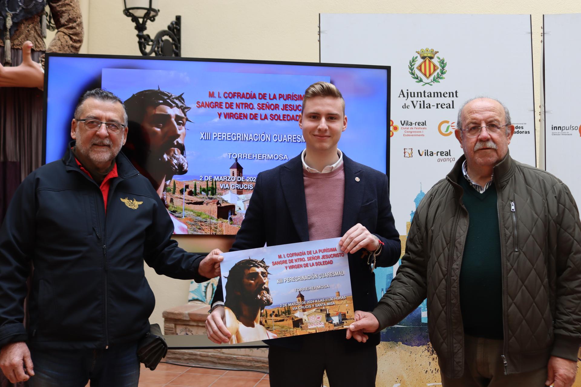 El regidor de Turisme, Javier López, i el president de la confraria de la Puríssima Sang, Felipe Monfort, acompanyats del responsable de la secció de guàrdies romanes de la Sang, Pascual Costa, han presentat el cartell de la XIII Peregrinació Quaresmal a Torrehermosa, població natal del patró de la ciutat.