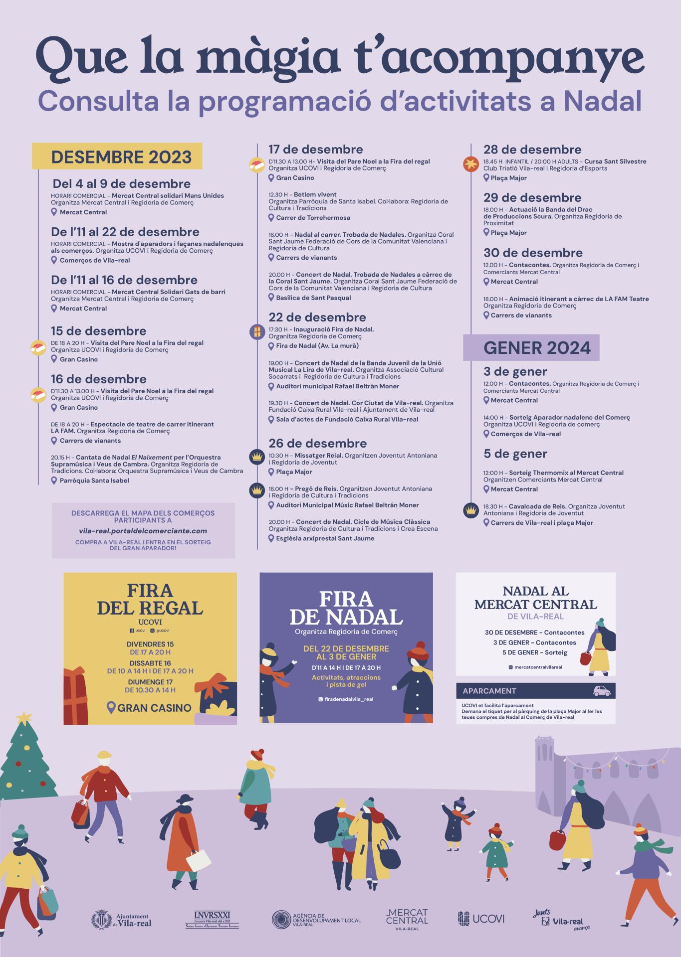 Vila-real celebra els dies 15, 16 i 17 de desembre la Fira del Regal, impulsada per la Unió de Comerç de Vila-real (Ucovi), al Gran Casino. Amb aquest esdeveniment, que forma part de la campanya comercial de Nadal impulsada per la Regidoria de Comerç i Hostaleria amb la col·laboració d'Ucovi i el Mercat Central, els comerços de la ciutat volen unir en un espai una gran oferta de productes per a regalar aquest Nadal i facilitar així les compres nadalenques. A més, també s'han previst activitats d'animació com la visita del Pare Noel o un photocall per als visitants. L'horari de la fira serà: divendres 15, de 17.00 a 20.00 hores; dissabte 16, de 10.00 a 14.00 i de 17.00 a 20.00 hores; diumenge 17, de 10.30 a 14.00 hores.