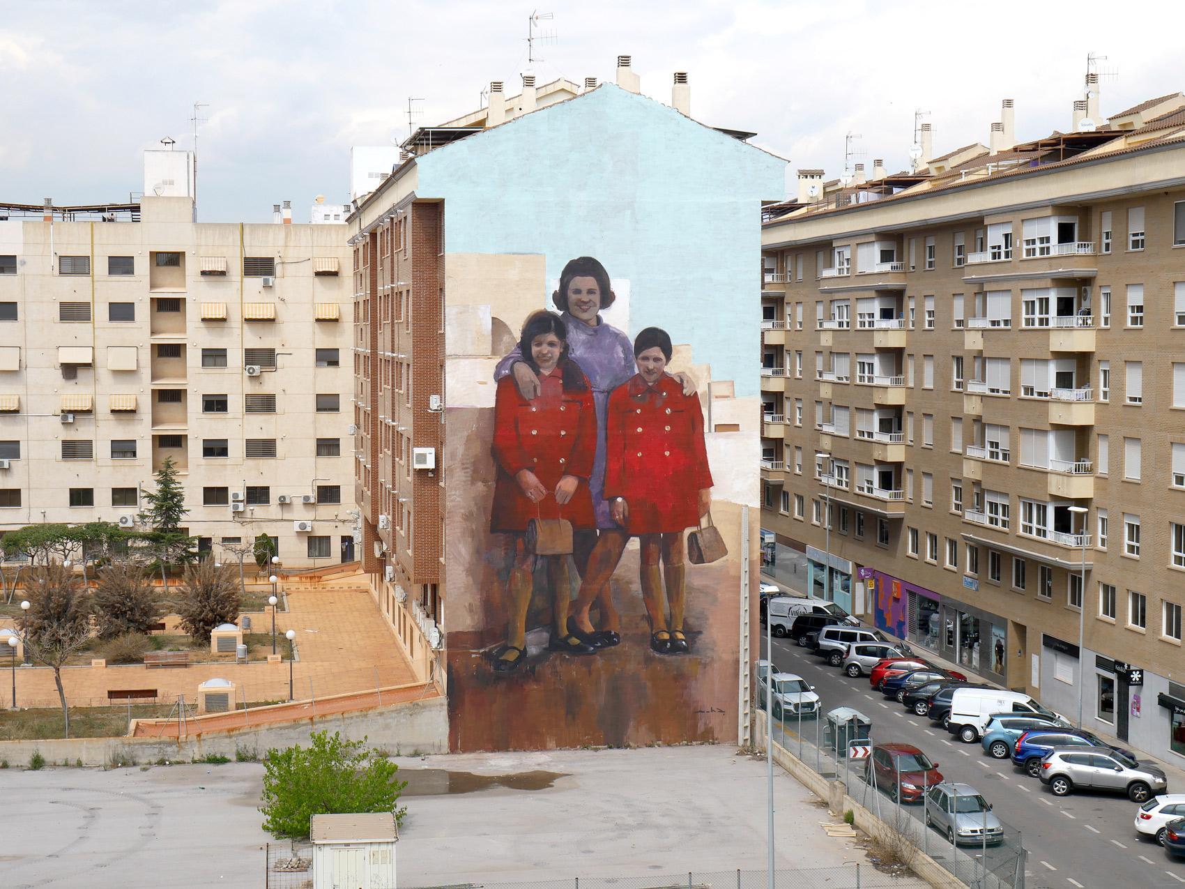 La Mare llueix ja sobre un ‘llenç’ de 25 metres d'alt per 12 d'ample estés sobre la paret d'una finca d'habitatges de set altures del carrer Jaume Roig, en la zona nord de Vila-real. Mostra a una mare amb les seues dues filles en un terrat, vestides per a una ocasió especial. Excepcionalitat dins de la quotidianitat a la fi de la dècada dels 60. “A l'artista li va cridar molt l'atenció la mescla d'aspectes estètics tan atractius com que dos de les tres persones que apareixen en la fotografia foren vestides igual i que aqueixes indumentàries resultaren cromàticament molt atractives; també l'aire de certa malenconia que impregnava tota la imatge”, afig Arnal.