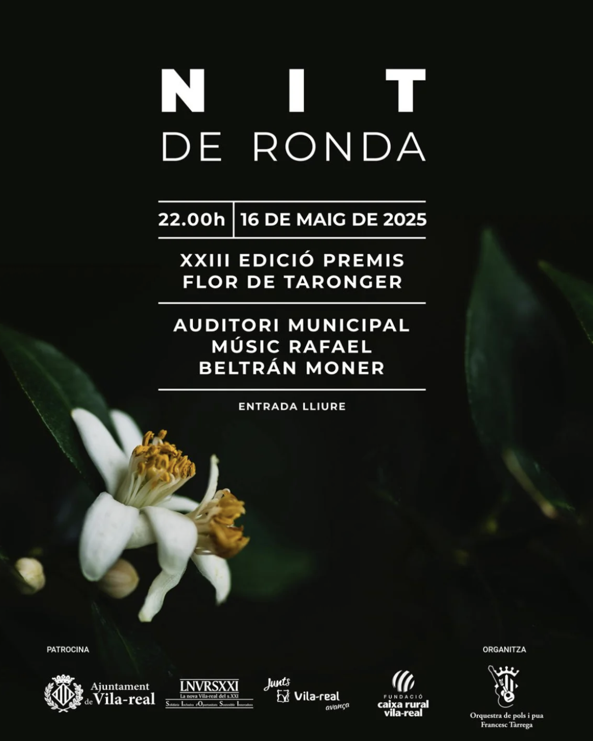 El pròxim divendres 16 de maig, a les 22.00 h, l’Auditori Municipal Músic Rafael Beltrán Moner tornarà a omplir-se de melodies amb motiu de la Nit de Ronda, que celebra enguany la XXIII edició dels Premis Flor de Taronger.