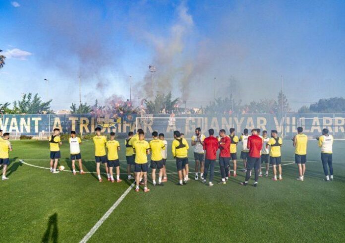 El grup d’animacióVillarrealFansha desplegat una pancarta on els jugadors podien llegir ‘Endavant, a triomfar. A guanyar Villarreal!’. Els aficionats han estat durant tota la sessió animant per a donar suport a l’expedició grogueta, que volarà demà sobre les 10 h cap a Gdansk (Polònia).