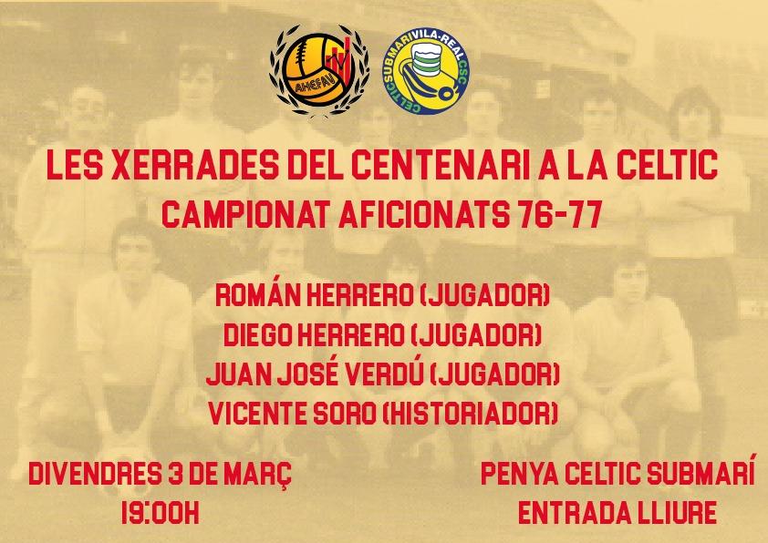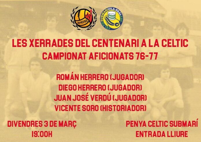 La penya Celtic Submarí i l'Associació per la Història i l'Estadística del Futbol a Vila-real (AHEFAV) continuen este proper divendres 3 de març el cicle Xerrades del centenari a la Celtic, l'objectiu de les quals és apropar a l'afició grogueta aquelles històries de la mà dels seus protagonistes.