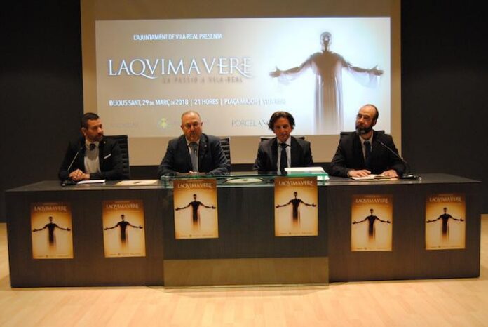La sala de projeccions de les instal·lacions de Porcelanosa Grupo ha acollit la presentació de la sisena edició de l’espectacle multidisciplinari 'Laquima vere’ per part del regidor de Turisme, Diego Vila, l’edil de Tradicions, Santi Cortells, juntament amb el de l'autor de l'obra, Alfredo Sanz, i el regidor coordinador de l'esdeveniment, Emilio Obiol. Aquesta exposició és ja una fita marcada en el calendari que se celebra i s’espera des de fa uns anys, malgrat que hui en la sala hi havia un gran buit, el de Pasqual Batalla, un dels principals impulsors de la iniciativa i que va faltar l'estiu passat. Tots els presents han dedicat un especial record en les seues intervencions a l’edil, acèrrim defensor i promotor de les tradicions i el patrimoni local. ‘Laquima Vere es representarà, es cantarà i es farà sentir a la plaça Major la nit del Dijous Sant, a les 21.00 hores. La presentació ha tingut lloc a la seu de la firma ceràmica vila-realenca com a entitat patrocinadora de l’esdeveniment que ha estat representada pel seu responsable de Noves Inversions, Ibán Molina.