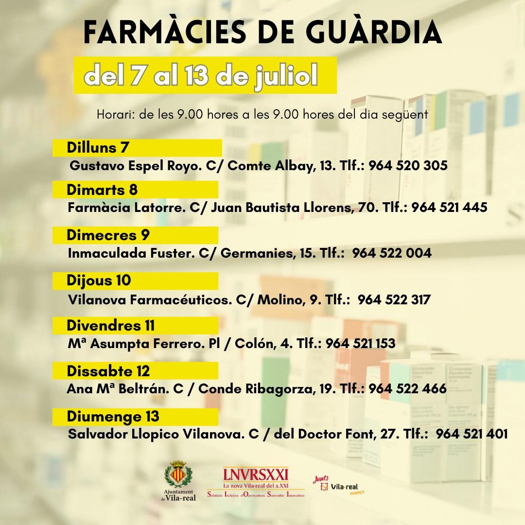 L’Ajuntament de Vila-real ha informat del calendari de farmàcies de guàrdia per a la setmana del 7 al 13 de juliol. Els establiments estaran disponibles des de les 9.00 hores del dia assignat fins a les 9.00 hores del dia següent.
