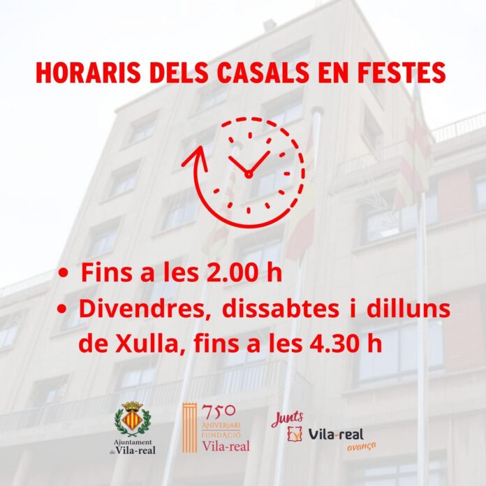 L’Ajuntament de Vila-real permetrà obrir els casals de les penyes fins a les 2.00 hores de la matinada, a excepció dels divendres, dissabtes i dilluns de Xulla, dies en els quals l’activitat està permesa a les seus dels penyistes fins les 4.30 hores. Els horaris especials formen part de les mesures extraordinàries amb motiu de les celebracions patronals de Sant Pasqual.