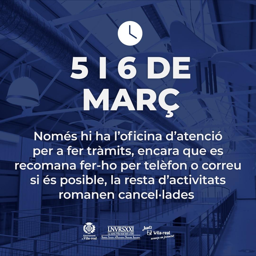L’Espai Jove de Vila-real ha anunciat ajustos en els seus serveis durant els dies 4, 5 i 6 de març. Segons les últimes informacions facilitades per l’Ajuntament, el centre romandrà obert al públic els dies 4 i 5 de març, però sense servei d’aula d’estudi. A més, per als dies 5 i 6 de març, totes les activitats programades han sigut cancel·lades, a excepció de l’oficina d’atenció per a tràmits, que es mantindrà operativa, encara que es recomana realitzar les gestions preferentment per telèfon o correu electrònic.