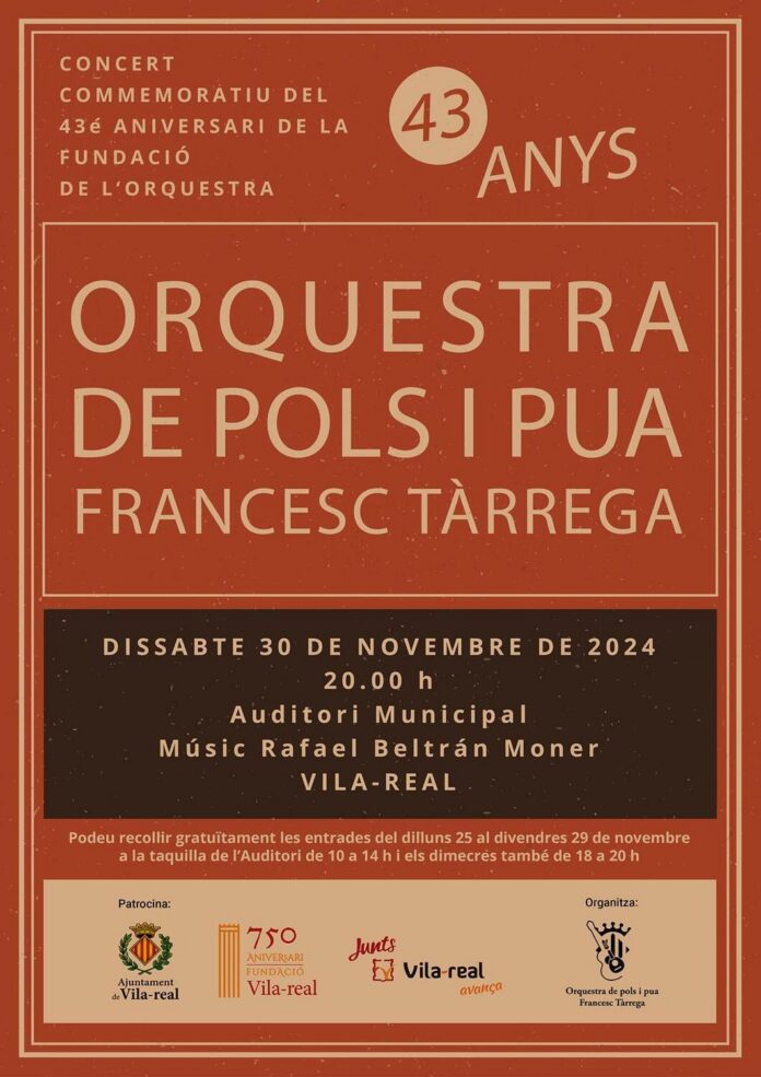 El dissabte 30 de novembre a les 20:00 hores, l'Auditori Municipal Músico Rafael Beltrán Moner acollirà un concert molt especial de l'Orquestra de Pols i Pua Francisco Tárrega, que celebrarà el seu 43é aniversari de fundació. Com cada any, l'orquestra rendirà homenatge al il·lustre fill de la ciutat, Francisco Tárrega i Eixea, compositor fonamental en la història de la música clàssica.
