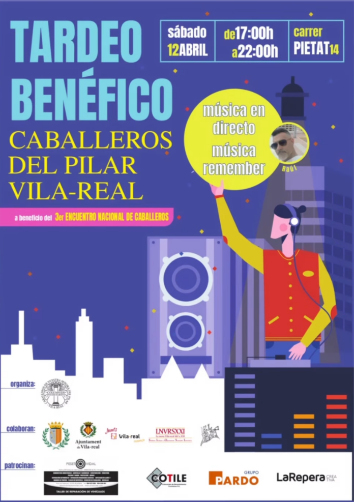 Aquest dissabte 12 d’abril, el carrer Pietat de Vila-real acollirà una nova edició del 'Tardeo' Benèfic organitzat pels Cavallers del Pilar, un esdeveniment festiu i solidari destinat a recaptar fons per al 3r Encuentro Nacional de Caballeros.