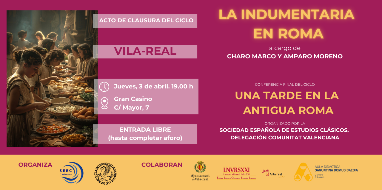 Vila-real acollirà el proper dijous, 3 d’abril, la conferència 'La indumentària a Roma', que servirà de cloenda del cicle Una vesprada a l'antiga Roma organitzat per la delegació a la Comunitat Valenciana de la Societat Espanyola d’Estudis Clàssics (SEEC).