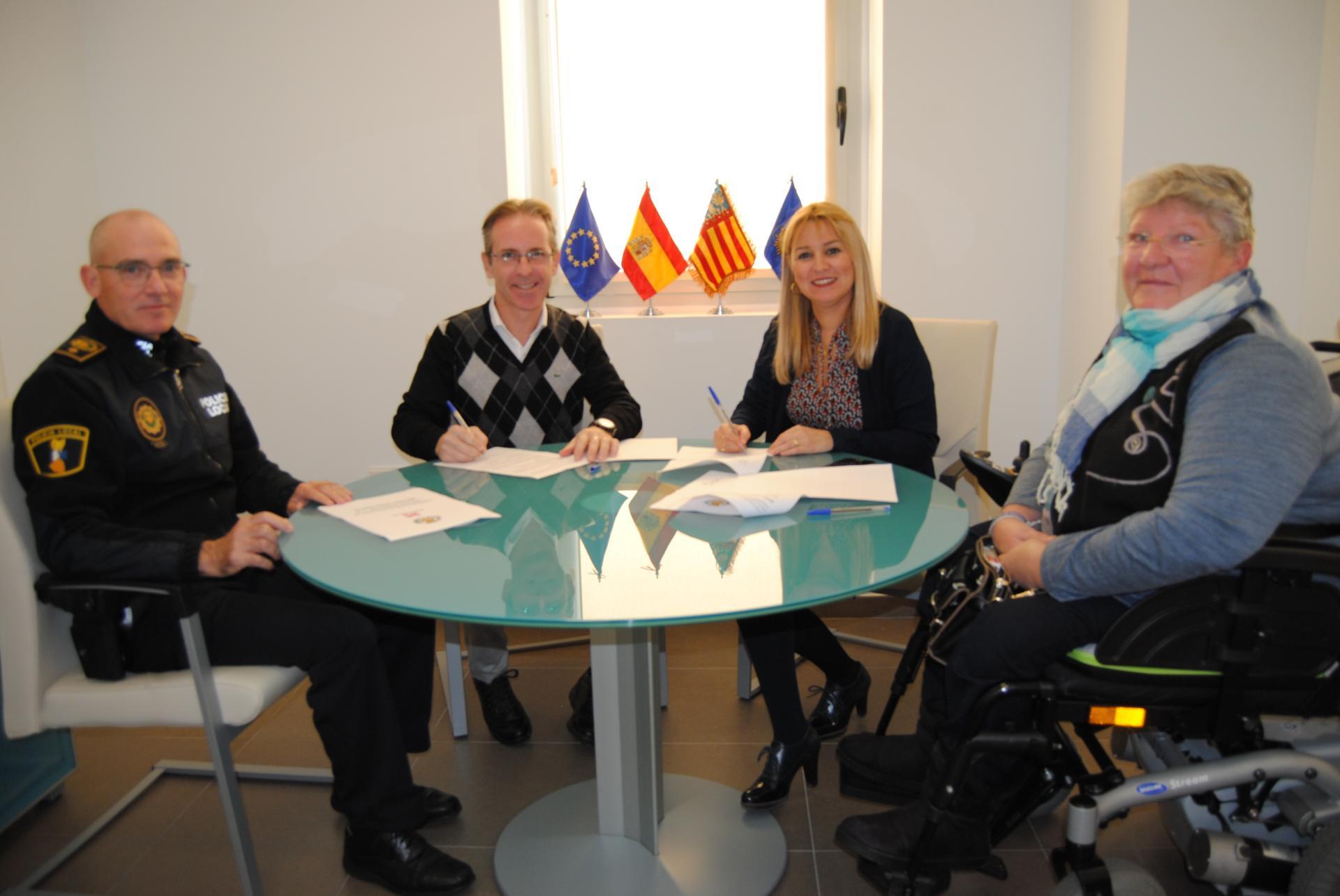 La regidora de Seguretat Ciutadana, Silvia Gómez; el comissari principal de la Policia Local, Domingo Adán; el representant de Grúas Tomás, Alejandro Bellido, i la presidenta d’Acudim, Fina Mora, s'han reunit per a la formalització de l'acord i per a donar a conèixer els detalls que s'inclouen en el pacte aconseguit.
