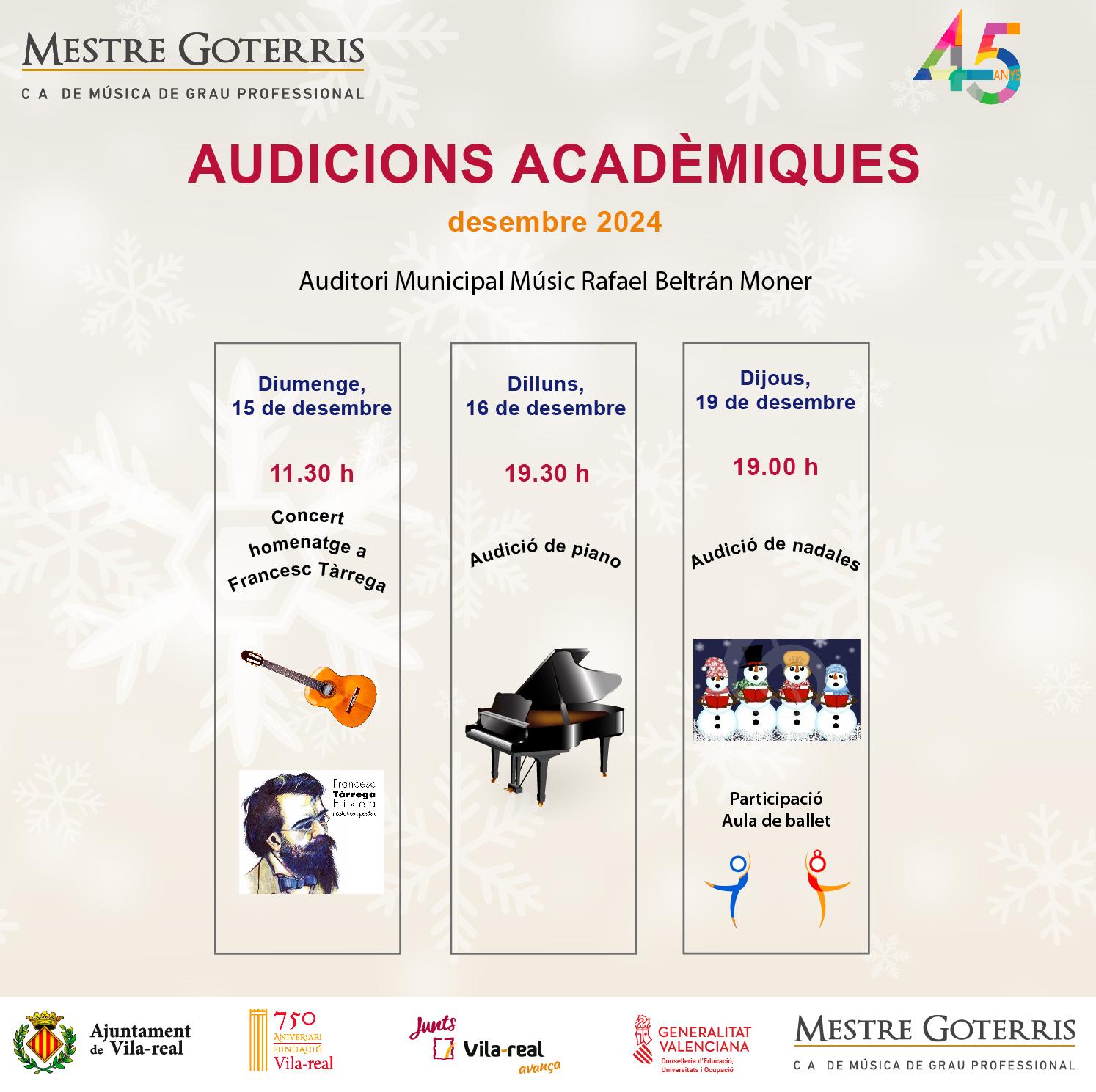 El Conservatori Mestre Goterris de la ciutat ha preparat una sèrie d'esdeveniments musicals que van començar aquest diumenge, 15 de desembre, amb motiu del Dia Internacional de Francisco Tárrega. En aquest acte, l'alumnat del conservatori participarà en un concert homenatge que es celebrarà a les 11.30 h al Auditori Municipal Músico Rafael Beltrán Moner, en què es rendirà tribut a aquest cèlebre compositor.