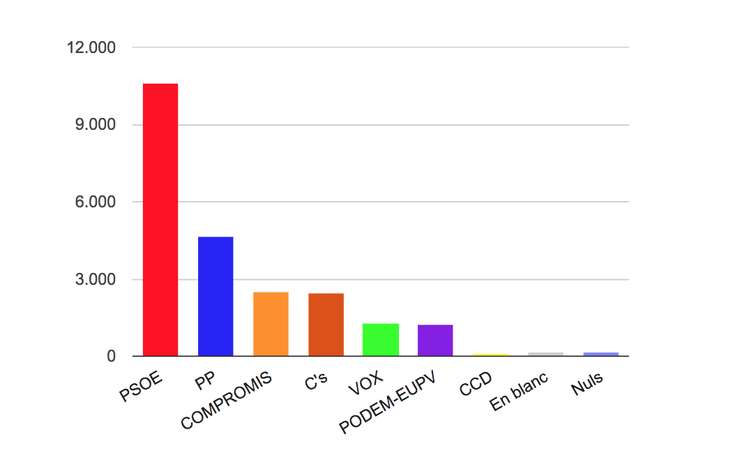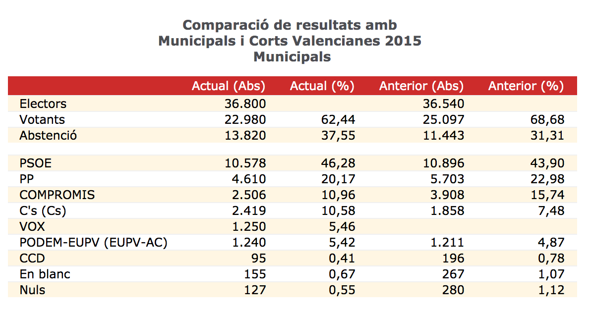 Ja des dels primers minuts s’ha evidenciat que el PSOE hi havia obtingut una holgada majoria i efectivament, amb el 30% dels vots escrutats a penes hi ha hagut canvis. Finalment els socialistes han revalidat la majoria absoluta amb 10.578 vots, el 46,28% del total. El PP, segona força, 4.610 vots (20,17%), Compromís s’ha batallat el tercer lloc quasi fins a l’últim moment amb Ciutadans i finalment ha aconseguit 2.506 vots (10,96%). Cs, quarta força, amb 2.419 vots, (10,58%) i Vox i Podem-EUPV han aconseguit un edil, els primers 1.250 vots (5,46%) i la confluència d’esquerres, 1.240 3 (5,42%). Per últim, Coalició de Centre Democràtic ha obtingut 95 vots, un 0,41%.