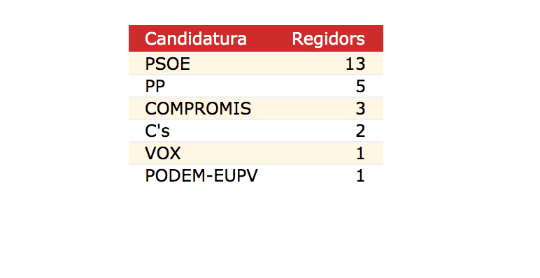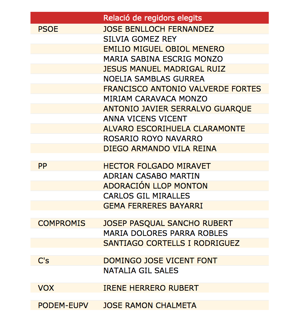 Vox i Podem entren a l’Ajuntament amb un regidor cadascun i el candidat socialista dóna la mà a Compromís i Podem per a formar un “govern de progrés com els de Madrid i València”. Així mateix, en la resta de formacions, cares llargues, ja que PP i Compromís obtenen mals resultats, els populars baixen de sis a cinc, Compromís passa de quatre a tres i Cs es manté amb dos i es congratula d’haver-hi augmentat 500 vots. La formació de Vicent fins a l’últim moment s’ha batut en una lluita amb la coalició per a obtenir el tercer regidor