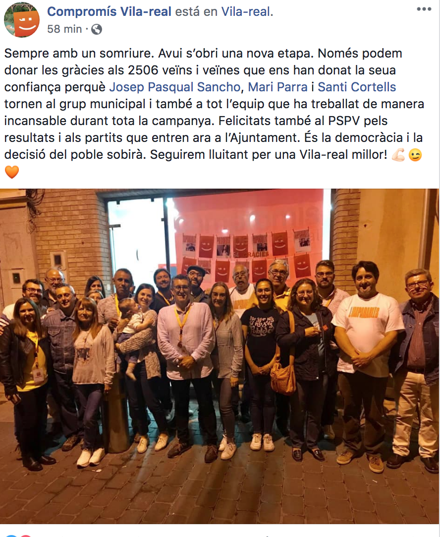 Només podem dir GRÀCIES a tots els veïns que avui, tenint moltes altres opcions sobre la taula, han triat la papereta de Compromís per Vila-real quan han anat al col·legi electoral. Una confiança que, tot i haver-se traduït en un menor nombre de regidors –un menys que al 2015-, agraïm eternament i volem fer-los saber que el seu vot no quedarà en el no-res, perquè a partir del proper 15 de juny anem a treballar de valent i amb obstinació per allò que ens mou: l’objectiu de millorar la vida de les persones. Ara s’obri un període de reflexió, però tenim clar que anem a deixar-nos la pell per Vila-real.