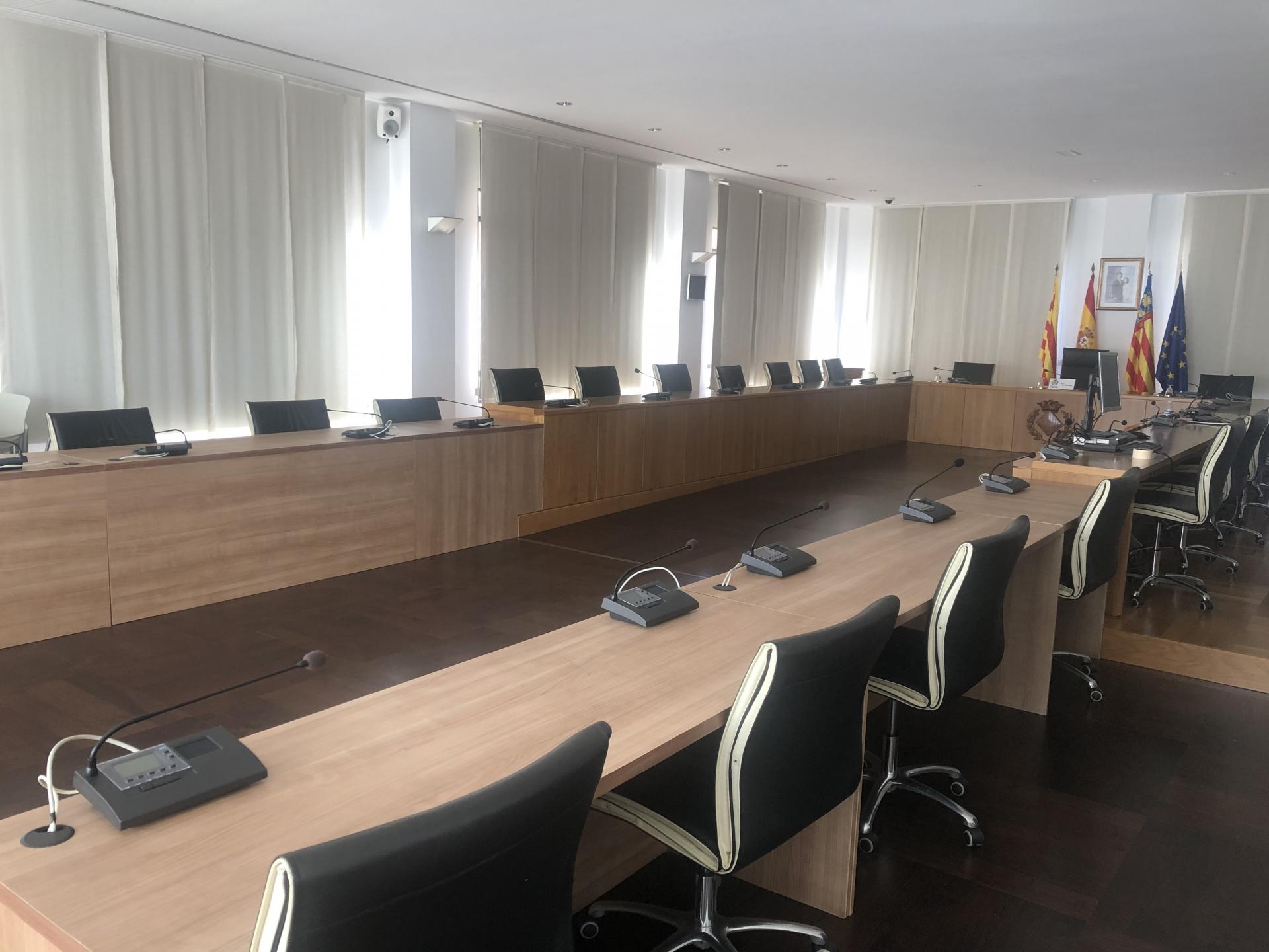 Ha sigut necessari adaptar la bancada que ocupen els 25 membres de la corporació, a més del secretari i l’interventor, de manera que els representants municipals puguen mantindre una distància aproximada d’1,5 metres. A causa d’aquesta reforma, la zona destinada al públic assistent a les sessions plenàries veu reduït el seu aforament.