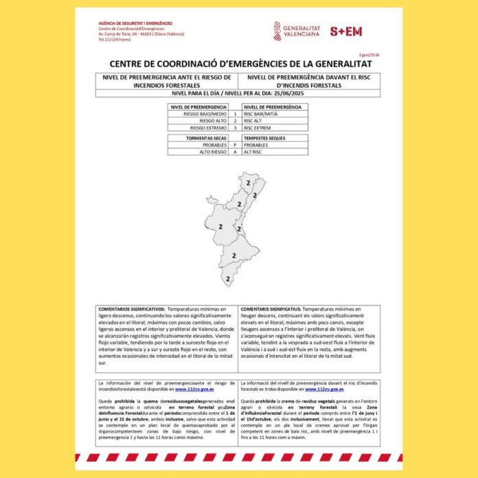 La Agència de Seguretat i Resposta a les Emergències de la Generalitat Valenciana ha activat per al dimarts 25 de juny de 2025 el nivell 2 de preemergència per risc d’incendis forestals —corresponent a nivell alt— en totes les comarques de la Comunitat Valenciana.